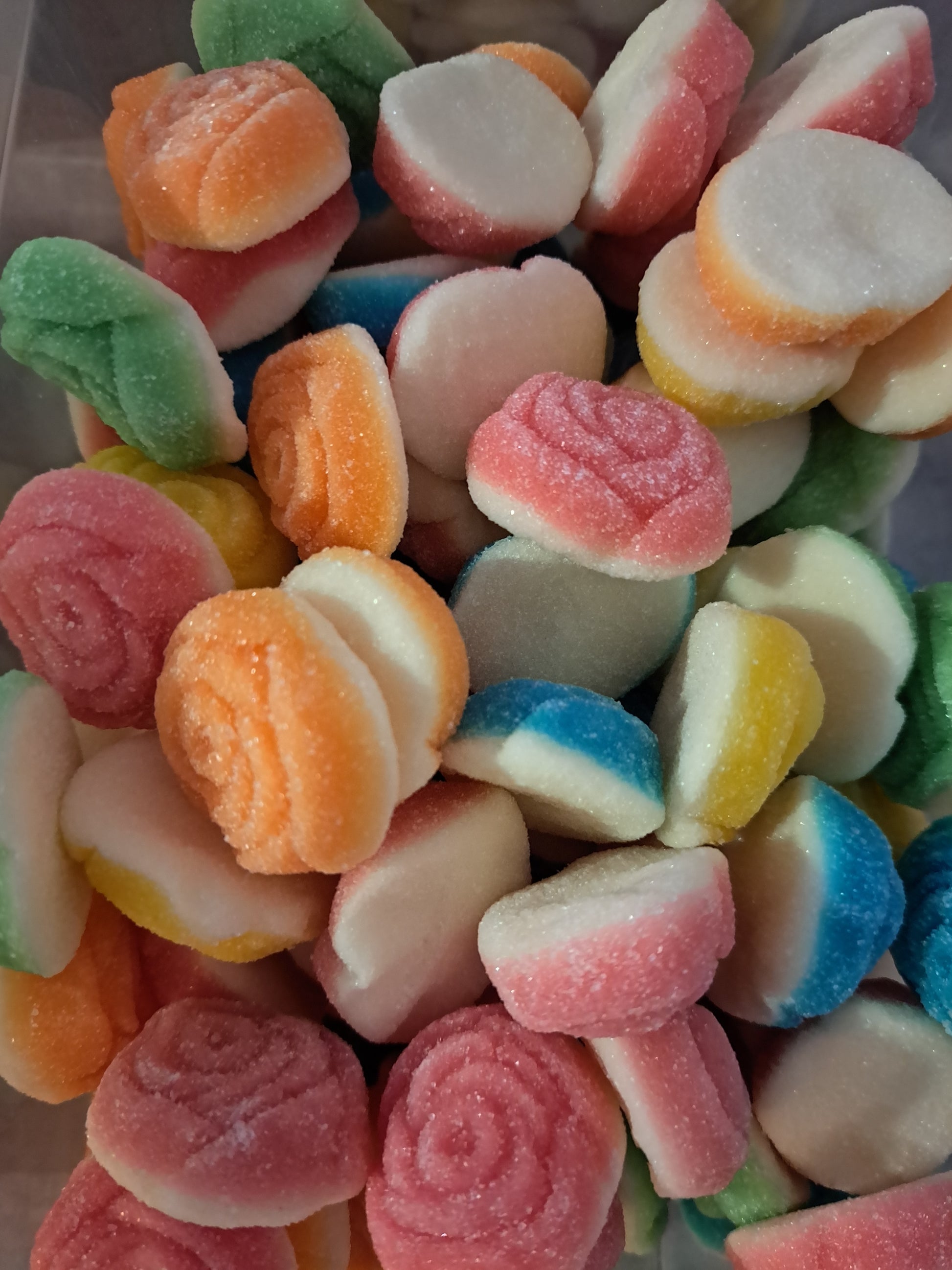 Sucre, sirop de glucose, eau, gélatine de boeuf, acidifiants : acide citrique, gélifiant : pectine, arômes, régulateur d'acidité : citrate de sodium, colorants E100, E120, E133.