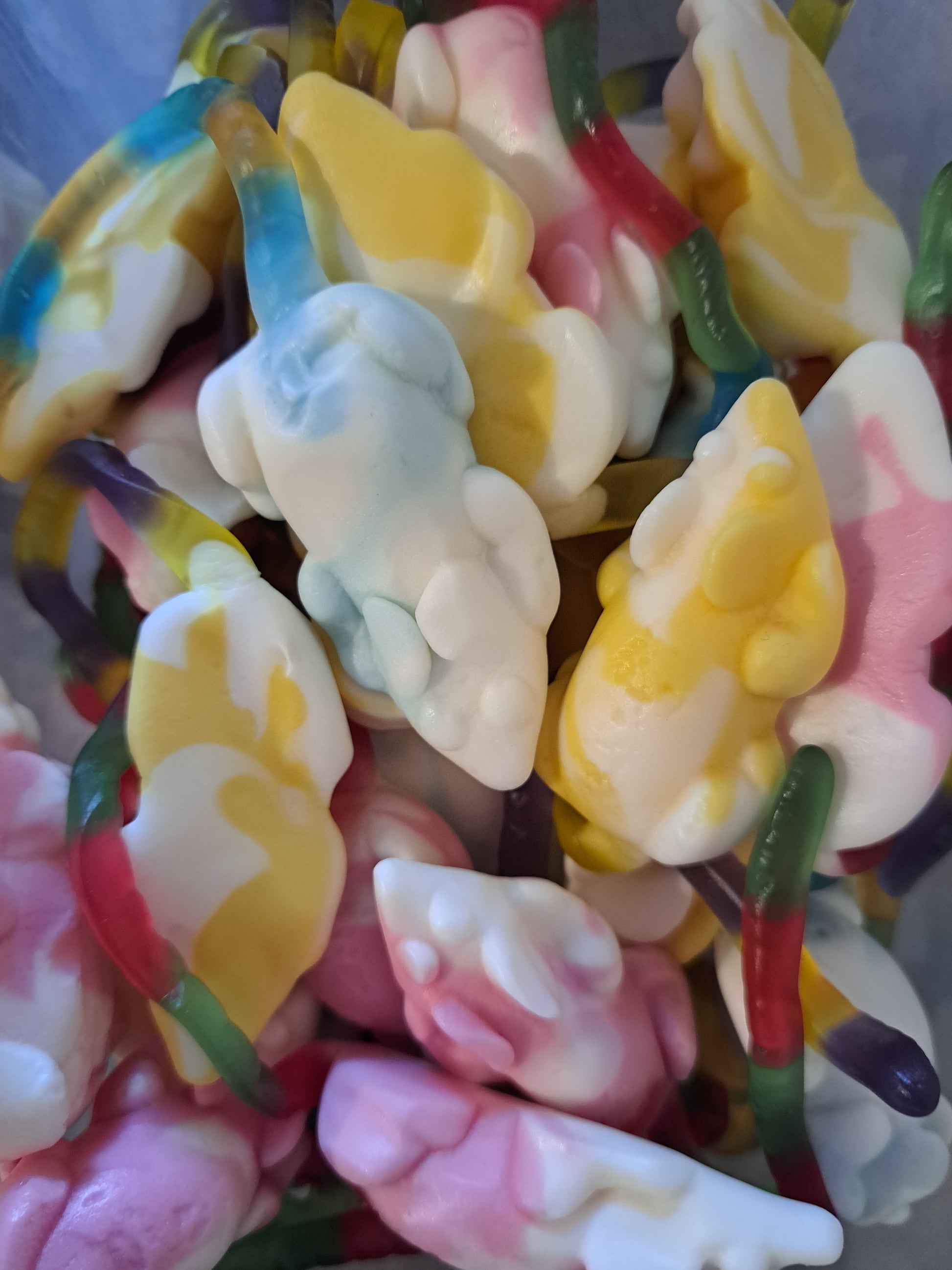 Sirop de glucose, sucre, gélatine, acidifiant : acide citrique, acide lactique,stabilisant : sorbitol, gélifiant : pectine, arômes, colorants : concentré de fruits et préparation d'extraits végétal (paprika), carmin, bleu patenté V, huile végétale, agent d'enrobage, cire d'abeille, cire de carnauba.