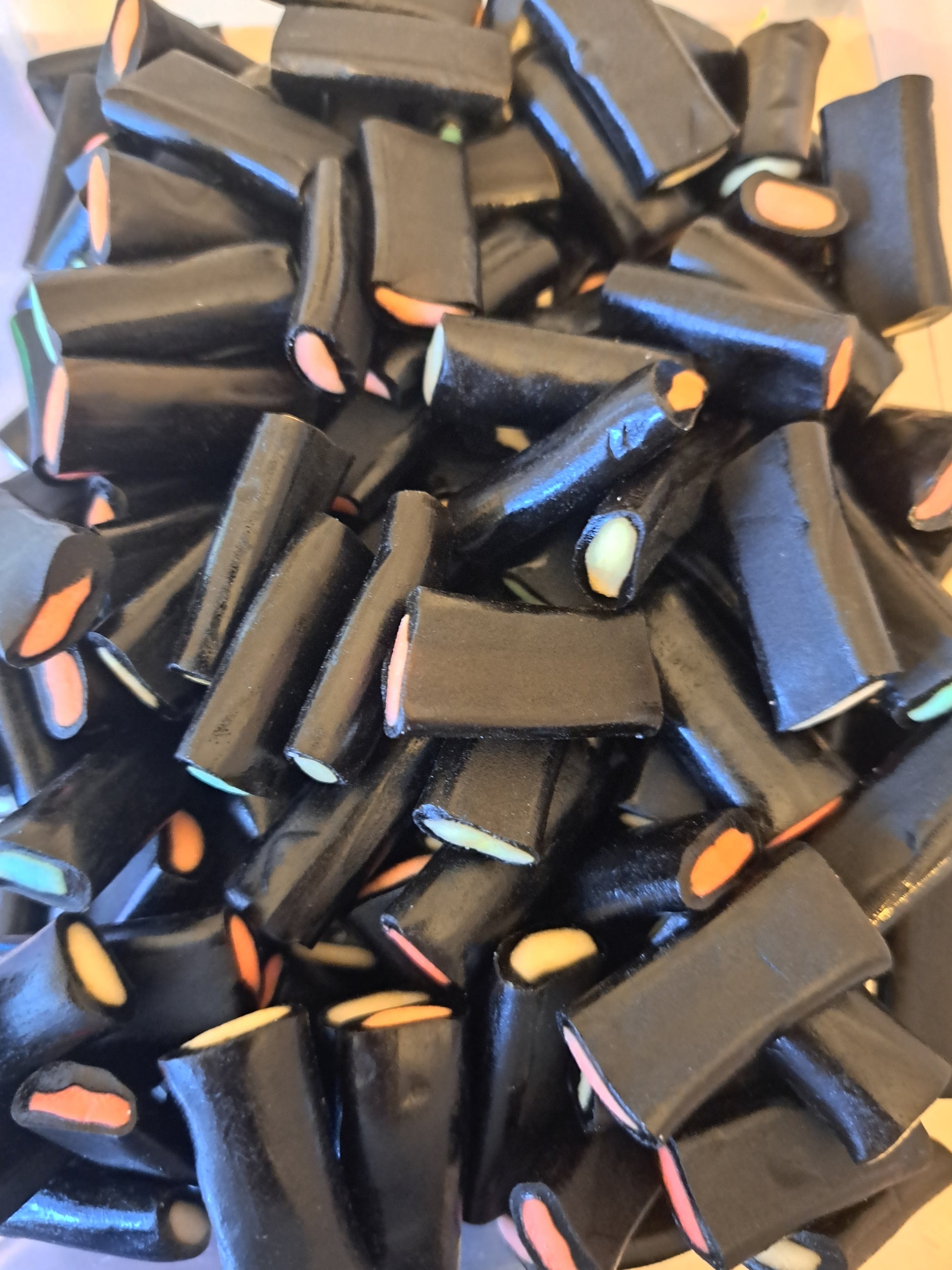 Sirop de glucose-fructose, farine de blé, (gluten), sirop de sucre inverti, sirop de mélasse, extrait de réglisse, eau, amidon de pomme de terre, huile végétale (palme) acidifiant E270, amidon modifié de maîs, humectant E422, sel, gélatine de boeuf, arômes, colorants: E100, E129, E133, E102, contient du gluten
