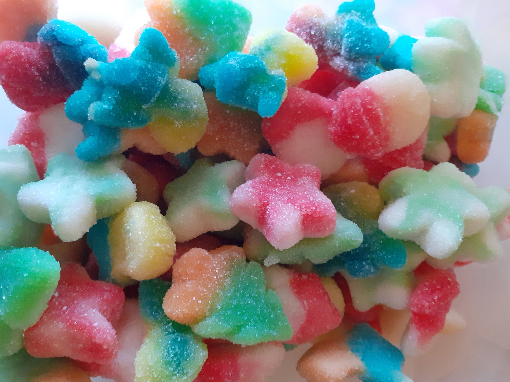 Sirop de glucose, sucre, eau, gélatine de boeuf, amidon modifié de pomme de terre, acidifiants: E270, E330, agent d'enrobage: huile végétale (palme), E901, E903, arômes, colorants: E129, E100, E133. Sans Gluten.
